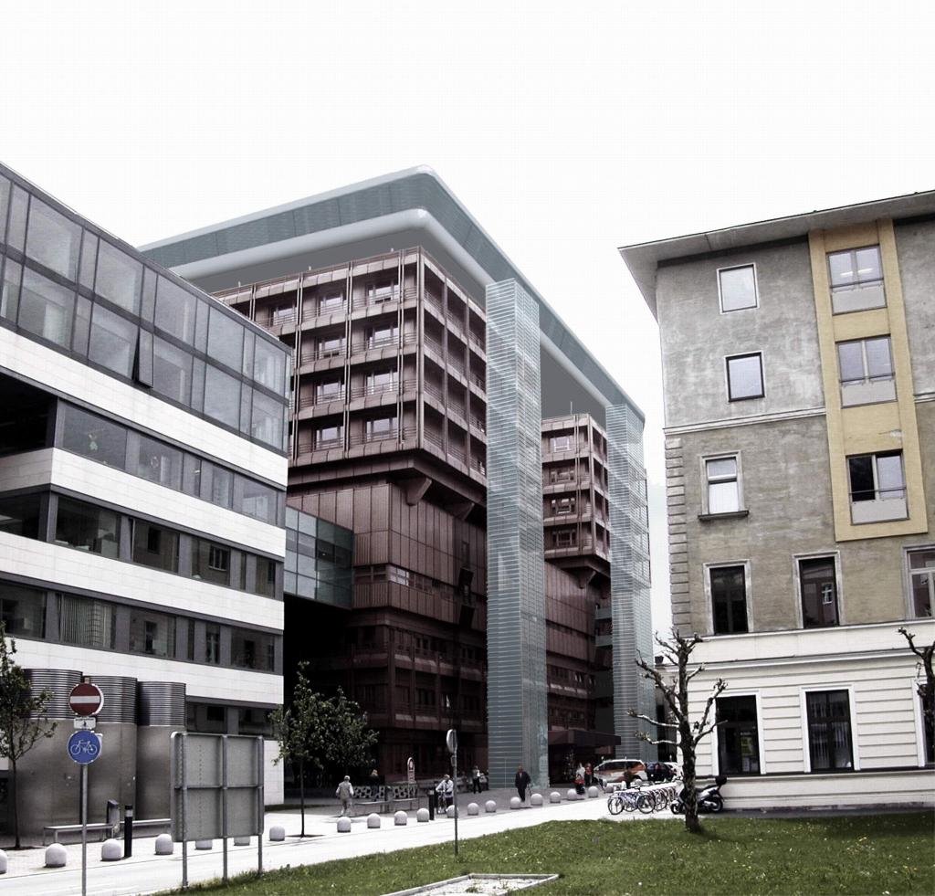 Der Entwurf sieht ein „schwebendes“ Geschoss G9 über ein nur teilweise verbautes Geschoss G8 vor, um eine klare architektonische Trennung zwischen Bestand und Aufstockung zu erreichen. Um das Gewicht für den Bestand gering zu halten, wurde eine Stahl-Verbundkonstruktion gewählt. Die Decke über dem G8 ist als Trapezblechverbundkonstruktion auf einer Stahlträgerunterkonstruktion konstruiert.